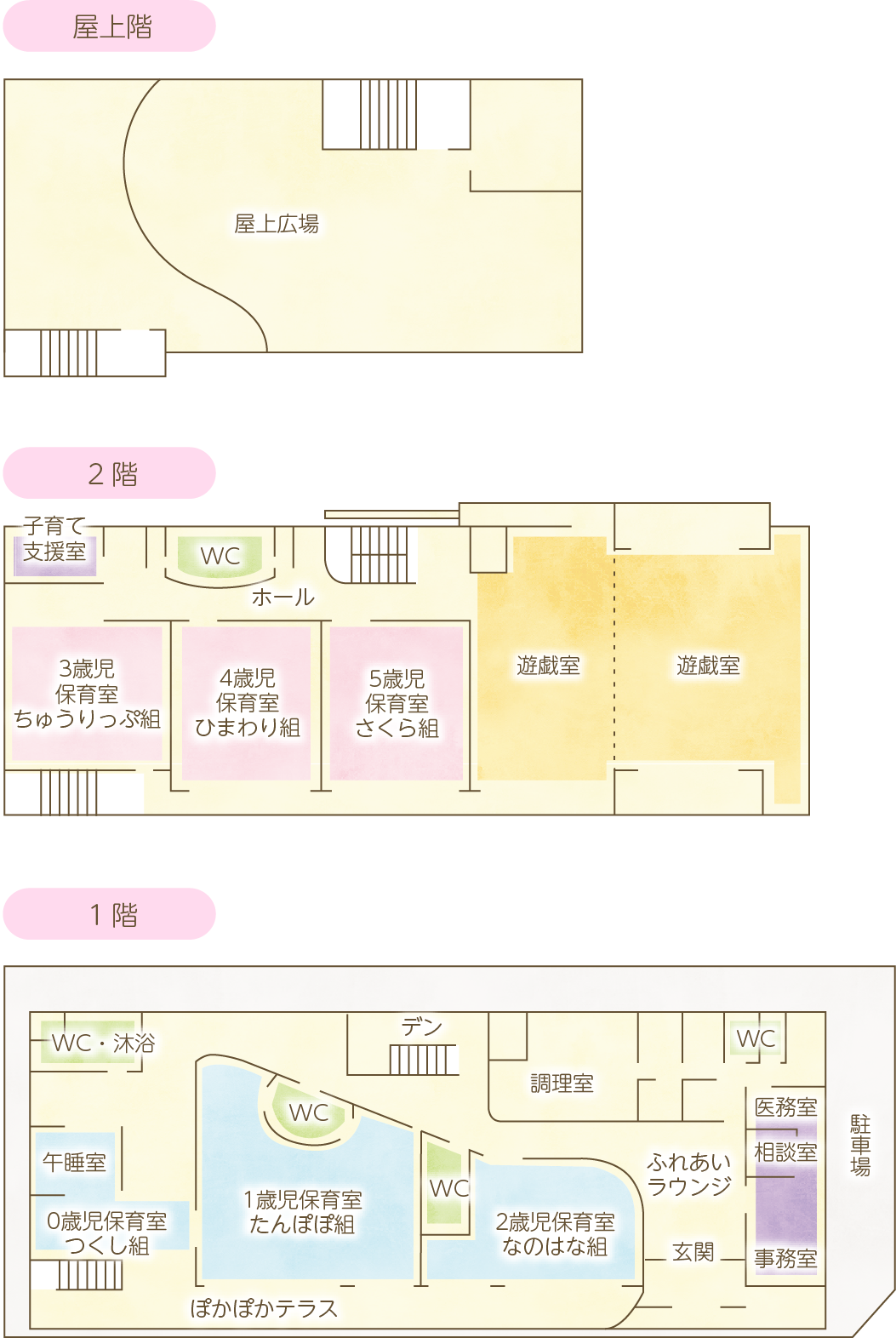 2階スペースは、3・4・5歳児の各保育室と遊戯室があります。